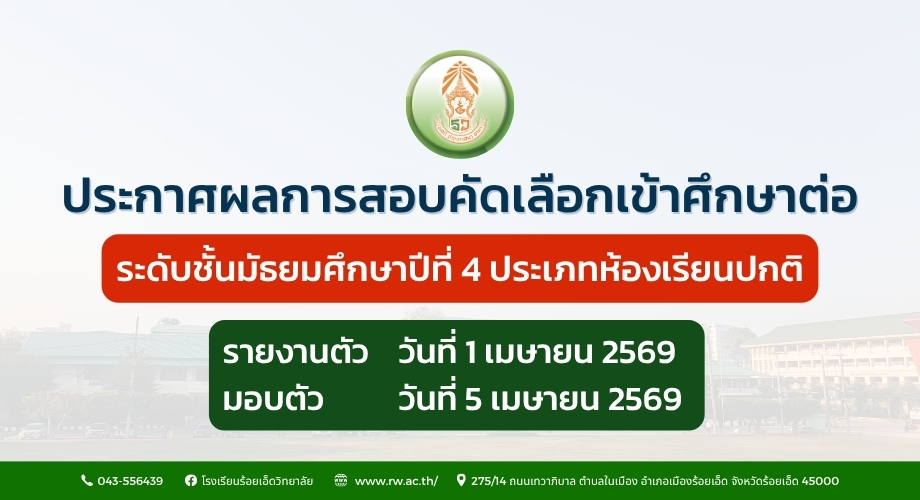 ประกาศผลการสอบคัดเลือกเข้าศึกษาต่อ ม.4 ประเภทห้องเรียนปกติ ปีการศึกษา 2569