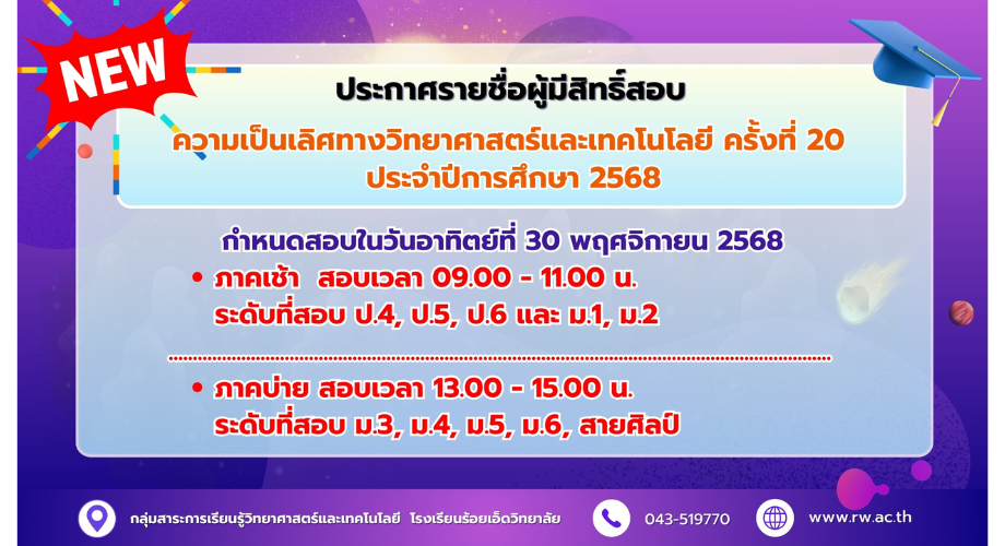 ประกาศรายชื่อผู้มีสิทธิ์สอบความเป็นเลิศทางวิทยาศาสตร์และเทคโนโลยี ครั้งที่ 20 ประจำปีการศึกษา 2568
